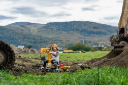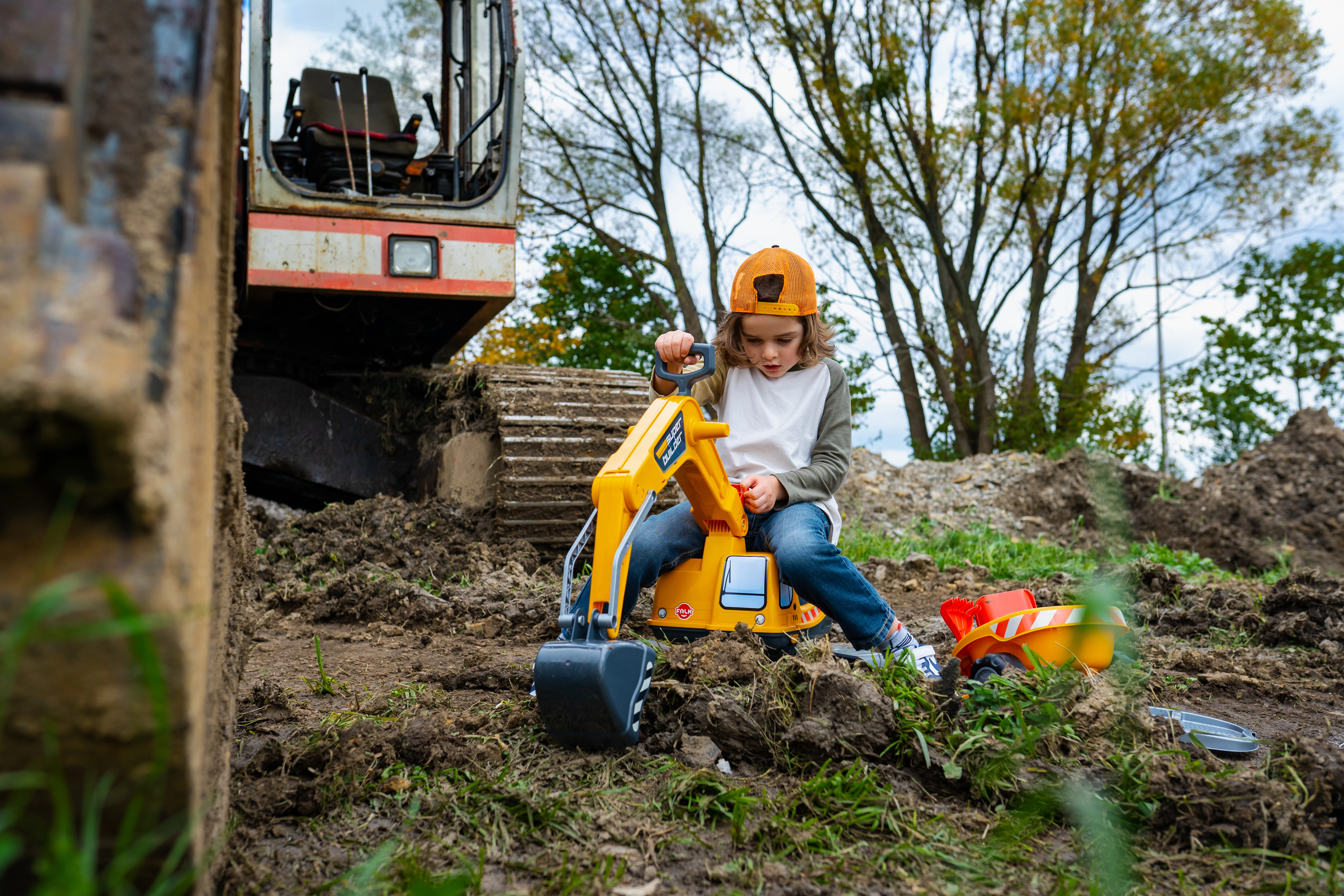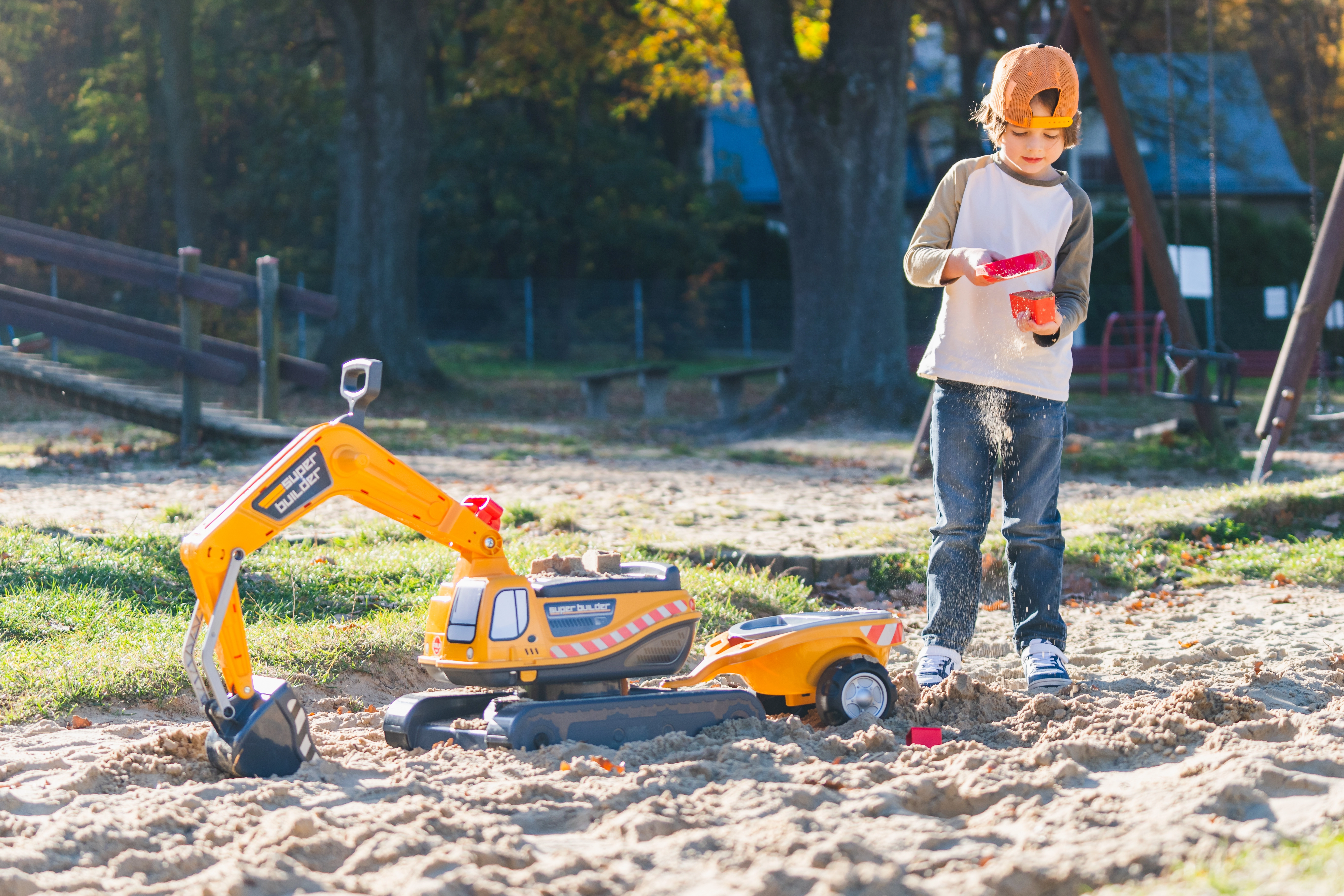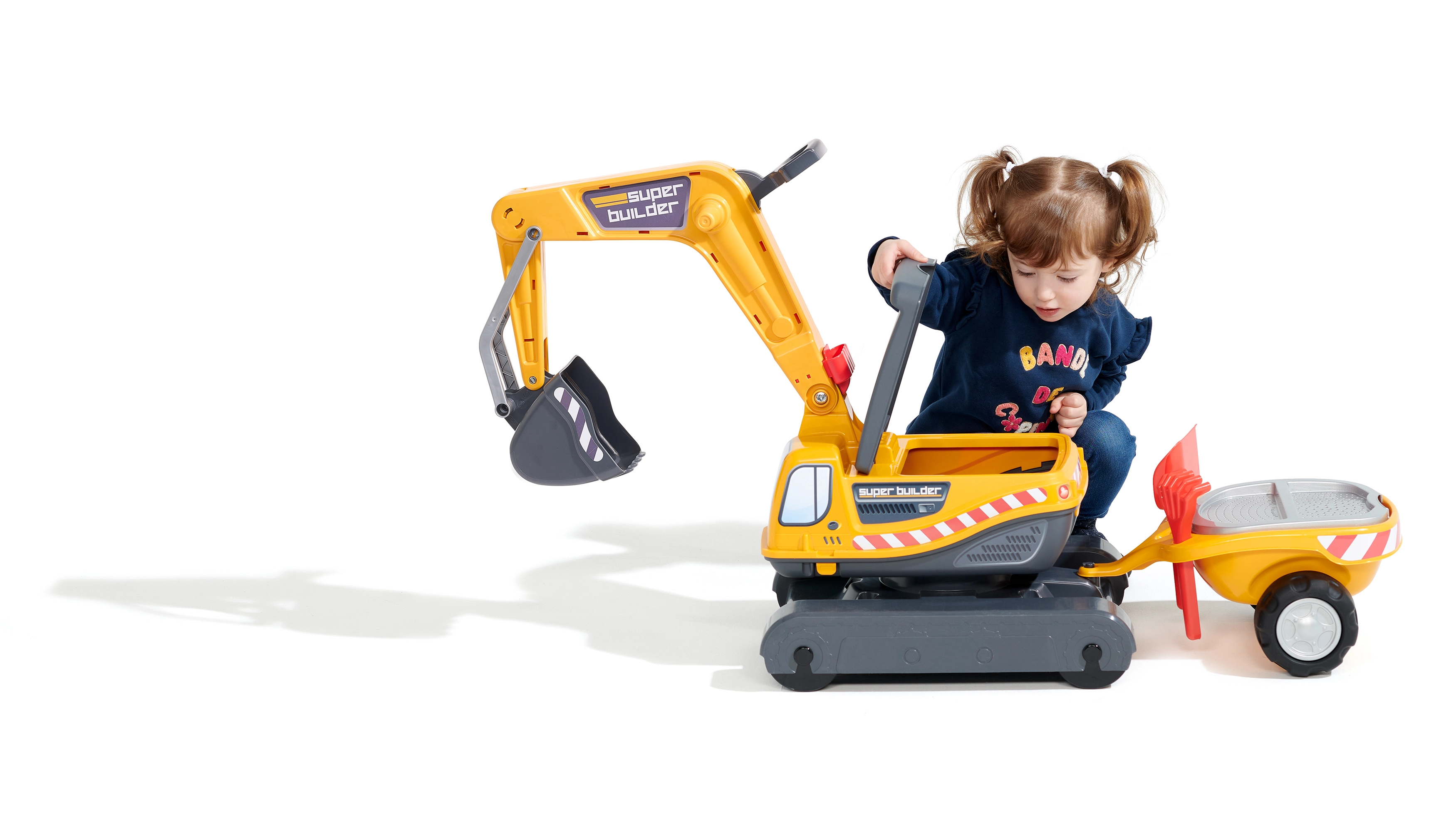 Rutscher Super Kettenbagger in Orange mit funktionsfähiger Schaufel, Kettenimitation, Anhänger und Sandspiel-Set – 2× Sandförmchen in Ziegelform, Schaufel und Harke. Aus hochwertigem und strapazierfähigem Kunststoff. Größe 85×38×67 cm. Alter 3+. Alle Falk-Traktoren sind bis 50 kg getestet – gemäß den Anforderungen europäischer Normen. Hergestellt in Frankreich.