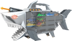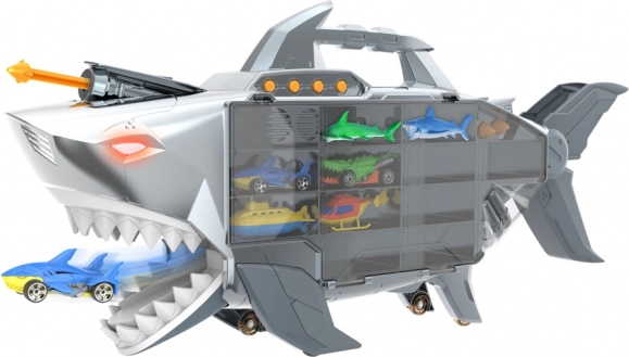 Im Inneren des Hais befinden sich praktische Fächer für bis zu 24 Fahrzeuge. Das aufklappbare Maul dient als Action-Ausfahrt für einen Blitzstart.