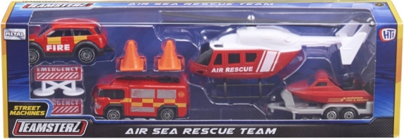 Das Teamsterz-Rettungsteam Air & Sea verwandelt das Kinderzimmer in eine Actionzone voller spannender Missionen. Hochdetaillierte Fahrzeuge mit Metallkarosserie und Kunststoffdetails halten intensivem Spiel stand und rollen dank frei laufender Räder sanft über jede Oberfläche. Der Hubschrauber mit von Hand drehbaren Rotorblättern verleiht jedem Rettungseinsatz den richtigen, realistischen Effekt.