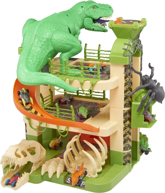 Garage mit Käfig, Dinosaurierschädel und Abschussvorrichtung; 1 Metallauto