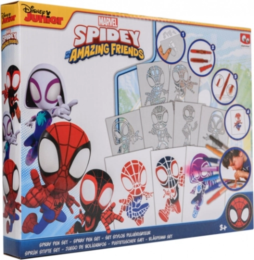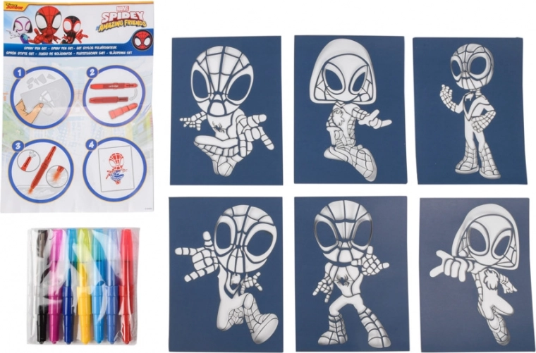 Malen mit Blasfilzstiften Spidy – enthält 7 Blasfilzstifte und 6 Schablonen mit Bildern.