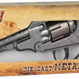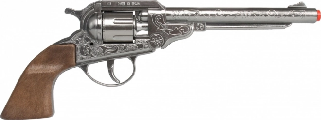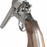 Der silberne Revolver, der Teil des Sets ist, ist achtschüssig und reich graviert, was jeder Schießerei zusätzliche Authentizität verleiht. Der Sheriffstern erhebt Sie zum wahren Hüter des Gesetzes.