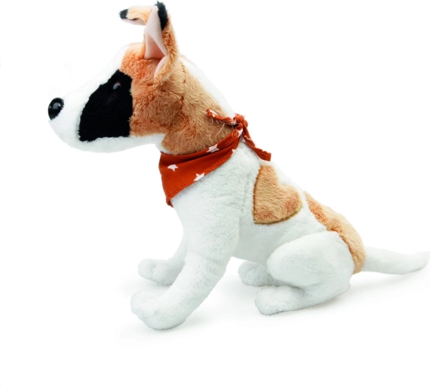 Der Plüschhund besteht aus einem äußerst weichen und angenehmen Material, das zum Streicheln einlädt.