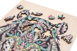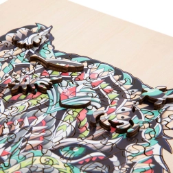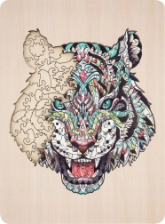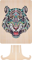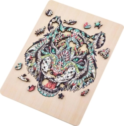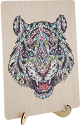 Holzpuzzle Tiger, 135 Teile – die Verpackung enthält einen Ständer, auf dem du dein Puzzle ausstellen kannst. Bildgröße 30 × 22,5 cm.