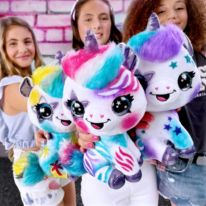 Einfaches Aufsprühen von Farben auf das Plüsch-Einhorn mit Schablonen oder freihändig. Perfekt für Einsteiger und kleine Künstler.