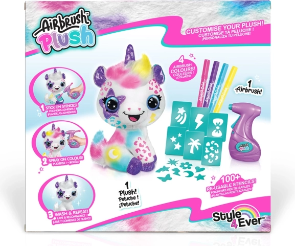 Plüsch-Einhorn, Airbrush-Werkzeug, 3 farbige Kartuschen, 120 selbstklebende Schablonen, Kunststoff-Schutzhandschuhe, Anleitung