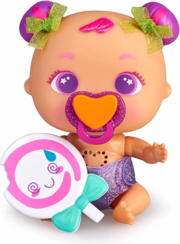 Im Set finden Sie eine weiße und eine glitzernde Windel, einen Schnuller sowie eine Flasche oder einen Lutscher – alles für fantasievolles, abwechslungsreiches Spiel.