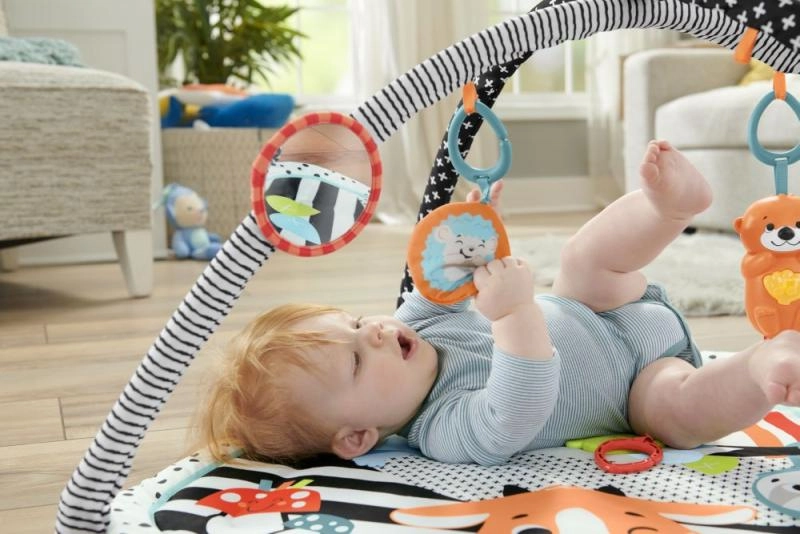 Die 3-in-1-Spieldecke mit Otter unterstützt die ersten Fähigkeiten Ihres Babys durch die Kombination aus Licht, Musik, kontrastreichen Mustern und Texturen. Zwei weiche Bogenstangen tragen einen Spiegel, Rasseln und ein BPA-freies Beißspielzeug, während der niedliche Otter mit Licht und Geräuschen bis zu 15 Minuten Melodien abspielt und mit sanftem Licht für beruhigendes Spiel sorgt.