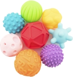 Entdecken Sie das Set von acht strukturierten Bällen, die entwickelt wurden, um die sensorische Wahrnehmung und Koordination Ihres Kindes zu fördern. Verschiedene Farben und Texturen sorgen für ein interaktives und lustiges Spiel.