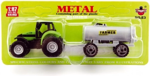Traktormodell mit großen schwarzen Rädern und grauem Tanker, bezeichnet als 'FARMER'.