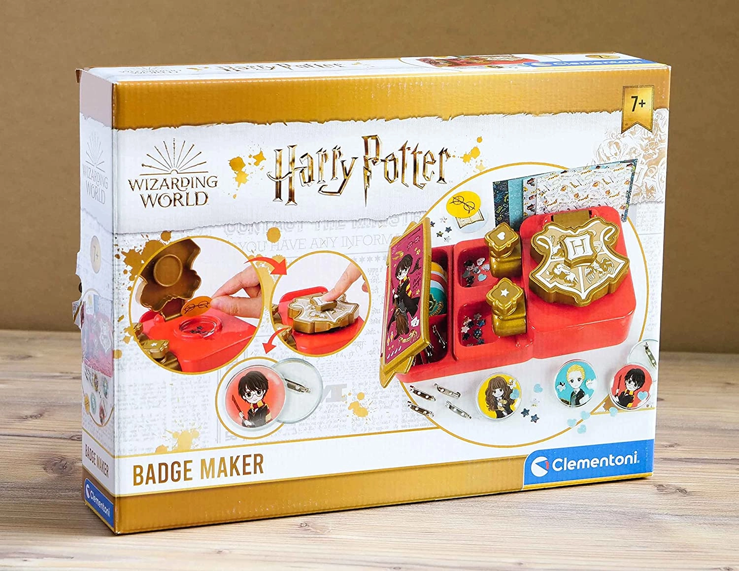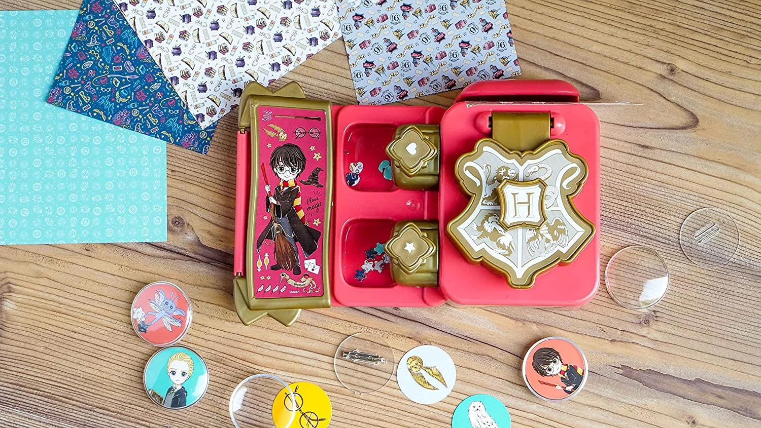Enthält eine Pressstation, grafische Vorlagen mit HARRY-POTTER-Motiven, Schutzfolien und Abzeichen-Komponenten – einfach zusammensetzen und gestalten.