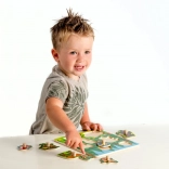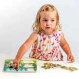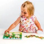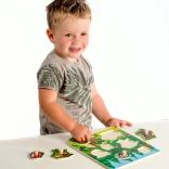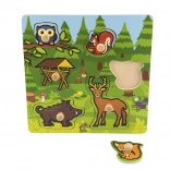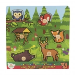 Waldmotive wie Eule, Eichhörnchen, Wildschwein oder Hirsch motivieren spielerisch zum Entdecken. Die Holzplatte mit Rahmen hält jedes Teil an seinem Platz und erleichtert die korrekte Zuordnung nach Form und Bild.
