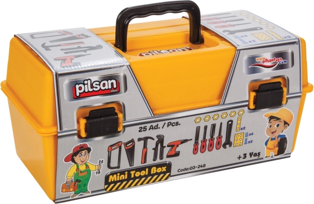 Pilsan Kinder-Werkzeugset bietet 34 sichere Teile für kleine Heimwerker ab 3 Jahren. Enthält Bohrmaschine, Schraubendreher, Säge, Schlüssel, Hammer, Zange sowie weiteres Zubehör und eine Montageplatte zum Schrauben. Fördert Feinmotorik, Kreativität und phantasievolles Spiel bei realistischen Handwerker-Rollenspielen.