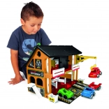 Der Inhalt umfasst eine Werkstatt, drei Autos, Rampen und 34 Aufkleber zur Dekoration.