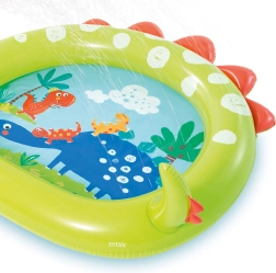 Fröhlicher aufblasbarer Pool mit Fontäne und Dinosauriermotiv, ideal für Sommerspaß im Garten. Der Pool besteht aus hochwertigem PVC-Material mit den Maßen 119 x 109 x 66 cm.