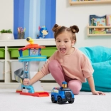 Platziert Chase in Zivil an der Vorderseite des Aufzugs und Chase als Held am hinteren. Hebt den Aufzug und beobachtet, wie Chase in Zivil sich in Chase als Held verwandelt. Wählt oben im Turm eine der 3 doppelseitigen Missionskarten und erfahrt, was die Aufgabe des Tages ist. Wenn es Zeit für einen Rettungseinsatz ist, saust die Rutsche hinunter direkt in das Polizeiauto von Chase und startet das Abenteuer, indem ihr den Auto-Werfer drückt. Für noch mehr Spaß könnt ihr weitere Welpen wie Marshall, Skye und Rubble mit ihren Fahrzeugen sammeln.