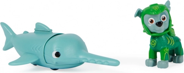 Rocky im nagelneuen Neoprenanzug und sein treuer Freund, der Sägefisch. Setze Rocky auf die Rückenflosse des Sägefischs, schiebe den Sägefisch nach vorne, um die Kopfbewegungen zu aktivieren, und starte zur Rettungsaktion. Geeignet ab 3 Jahren.