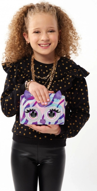 Die metallische Handtasche aus der Purse Pets Serie erfreut Kinder mit ihrem einzigartigen stilvollen Design und ihren interaktiven Funktionen. Die Tasche besteht aus glänzendem silbernen Stoff mit holographischen lila Streifen, die für ein modisches Aussehen sorgen. Dank des Berührungssensors reagiert die Tasche mit Zwinkern und gibt bis zu 30 verschiedene Geräusche von sich, was sie zu einem unterhaltsamen Begleiter für jeden Tag macht.