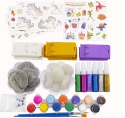 Dieses komplette Steinmalerei-Set bietet stundenlangen kreativen Spaß. Im Paket finden Sie 12 Steine, davon 6 mit Leucht-Effekt, sowie umfangreiches Zubehör zum Verzieren und Personalisieren. Ideal als Geschenk, für Bastelprojekte zu Hause oder für Schulprojekte.
