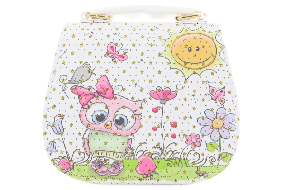 Diese weiße Handtasche mit Eulenmotiv ist das perfekte Accessoire für kleine Mädchen. Dank der kompakten Maße lässt sie sich bequem tragen und fasst alle kleinen Dinge, die ein Kind bei sich haben möchte – Taschentücher, kleine Spielzeuge oder Schätze vom Spaziergang.
