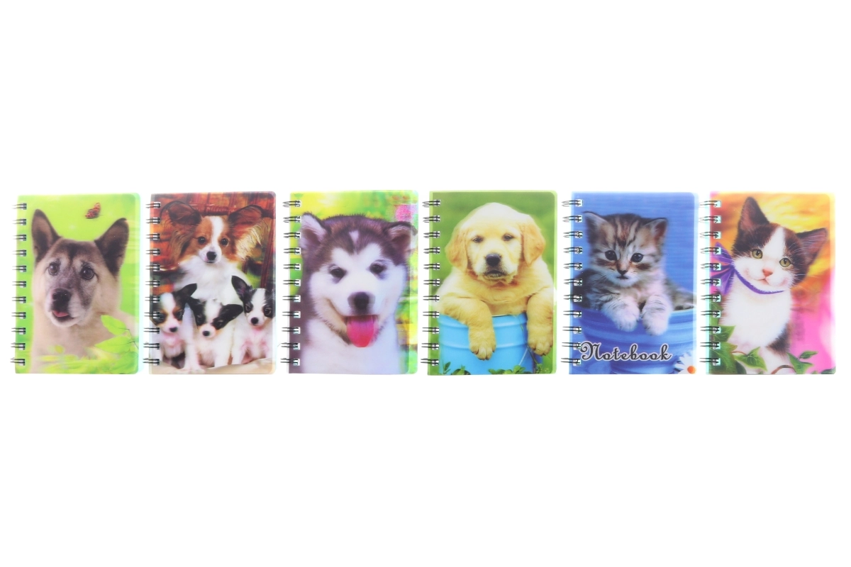 Praktisches Notizbuch mit plastischem 3D-Motiv von Hunden und Kätzchen – ideal für Schulnotizen, Arbeitsideen und persönliche Einträge. Dank des A6-Formats und der Ringbindung passt es leicht in die Tasche und die Seiten lassen sich komfortabel umblättern.