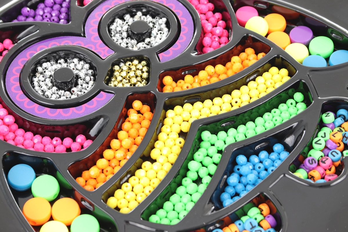 Das clevere Eulentablett mit getrennten Fächern erleichtert die Auswahl der Perlen und hält die Arbeitsfläche sauber.