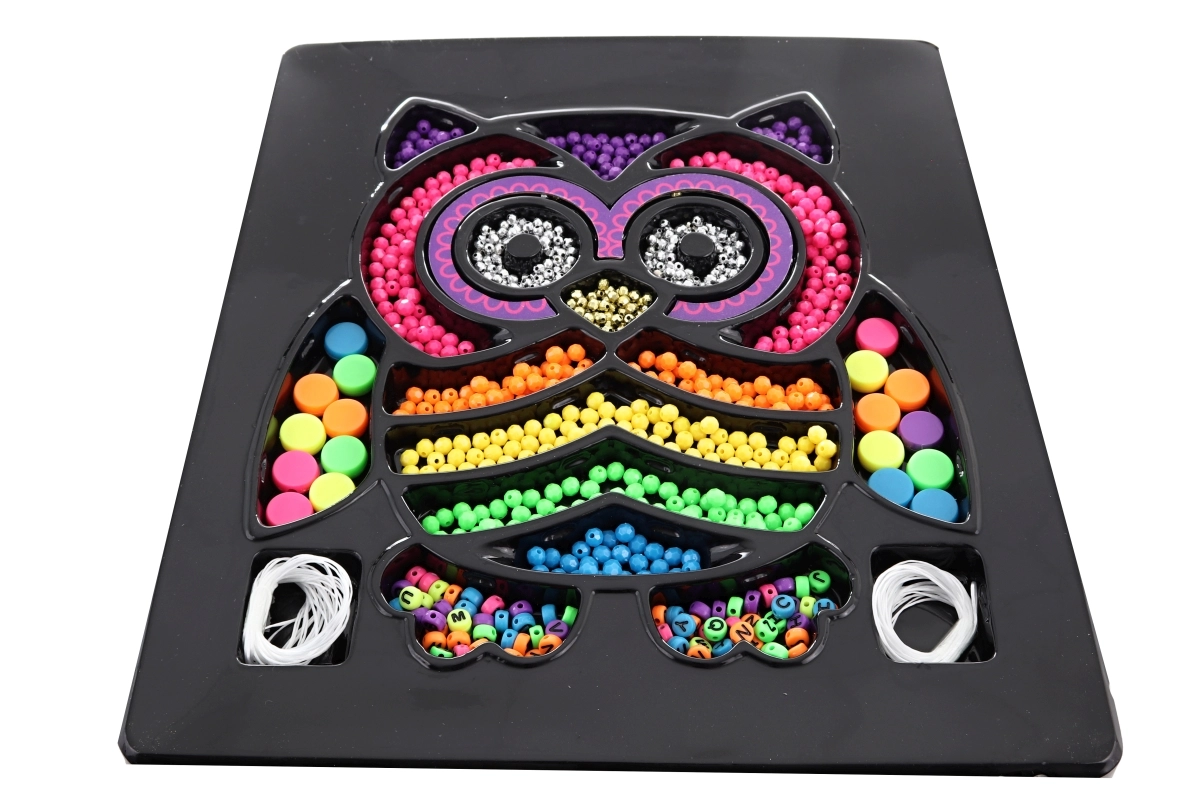 Dieses verspielte Perlen-Set im Eulendesign bietet Kindern stundenlangen Spaß beim Auffädeln und Gestalten origineller Schmuckstücke. Die vielfältigen Farben und Formen, einschließlich Buchstabenperlen, ermöglichen das Erstellen personalisierter Armbänder und Halsketten mit Namen oder Botschaften.