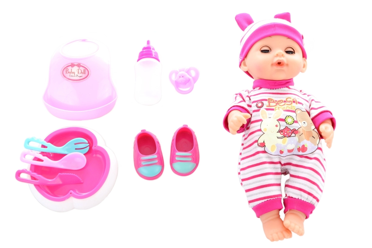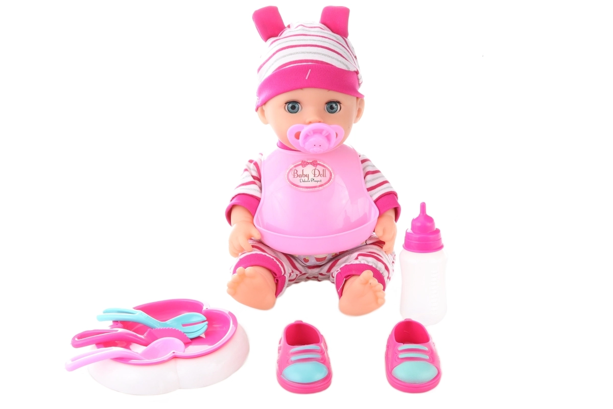 Zum Set gehören Schuhe, ein Kunststofflätzchen, ein Fläschchen, ein Teller, Besteck und weiteres Zubehör für abwechslungsreiches Rollenspiel.