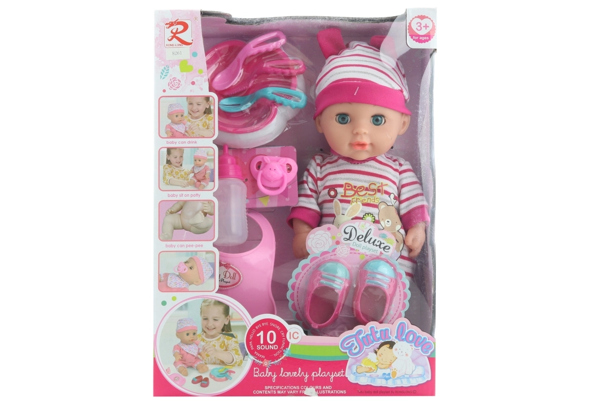 • Umfangreiches Zubehörset: Schuhe, Lätzchen, Fläschchen, Teller und weiteres Zubehör.
