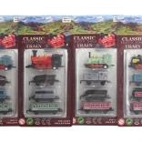 Set aus Metall-Eisenbahnen mit Lokomotive und drei Waggons
