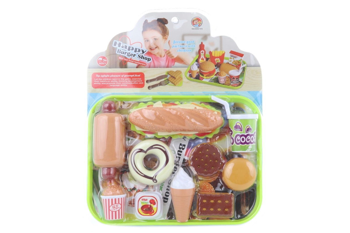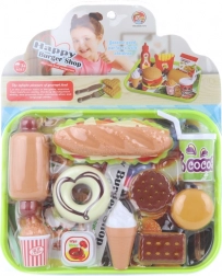 Zum Set gehören ein Hotdog, ein Donut, Kekse, Eis, ein Getränk und weiteres Zubehör für realistisches Kochspiel. Das Set ist eine tolle Geschenkidee und ergänzt jede Kinderküche oder jeden Kaufladen hervorragend.
