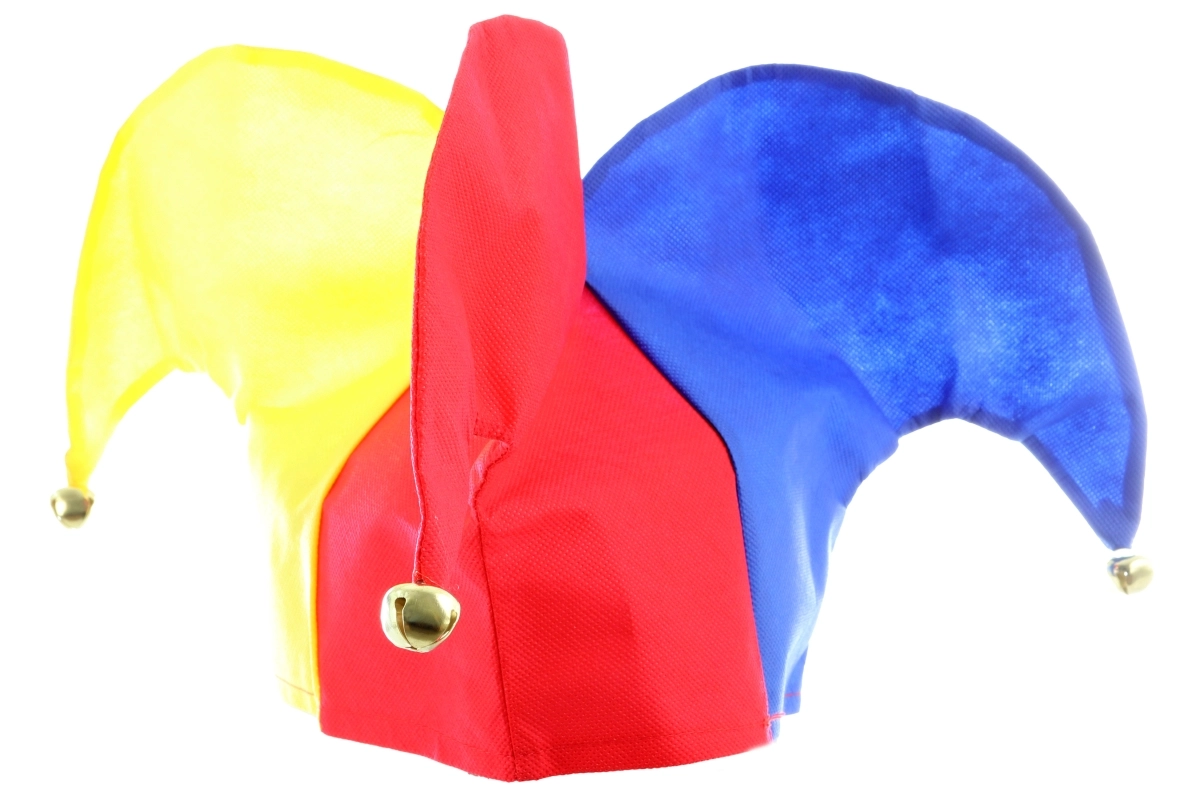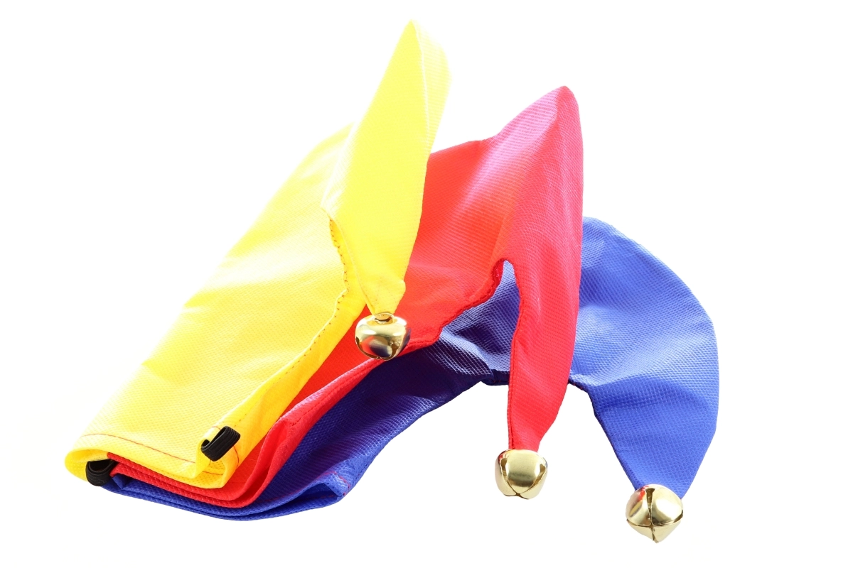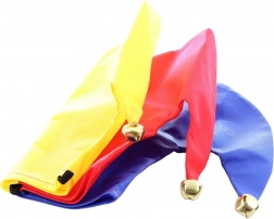 Bunte Clownmütze in Gelb, Rot und Blau mit Metallglöckchen für einen spielerischen Effekt bei jeder Bewegung.