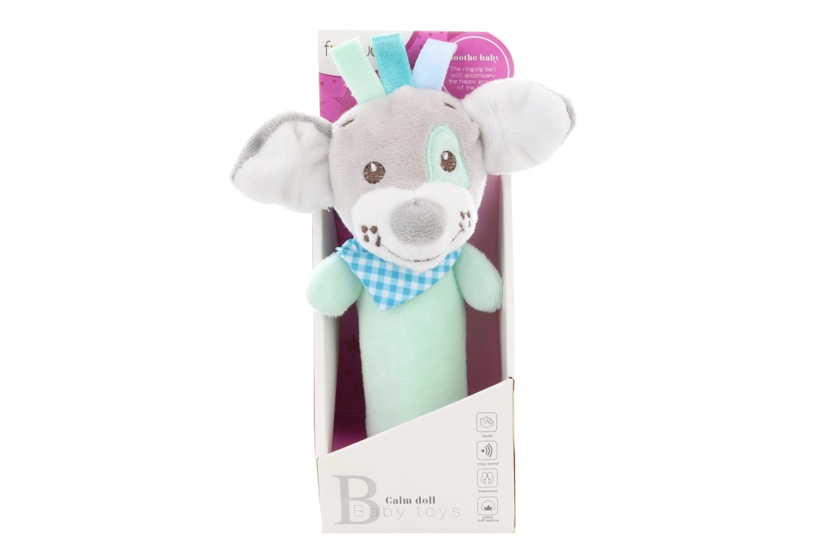 Dieses kuschelweiche Plüschrassel mit grünem Hündchen ist das ideale erste Spielzeug für Neugeborene. Dank Quietsche und Rasselgeräusch wird das Gehör stimuliert, während kräftige Farben und Kontraste die visuelle Wahrnehmung unterstützen. Die ergonomische Form erleichtert das Greifen mit kleinen Händchen.