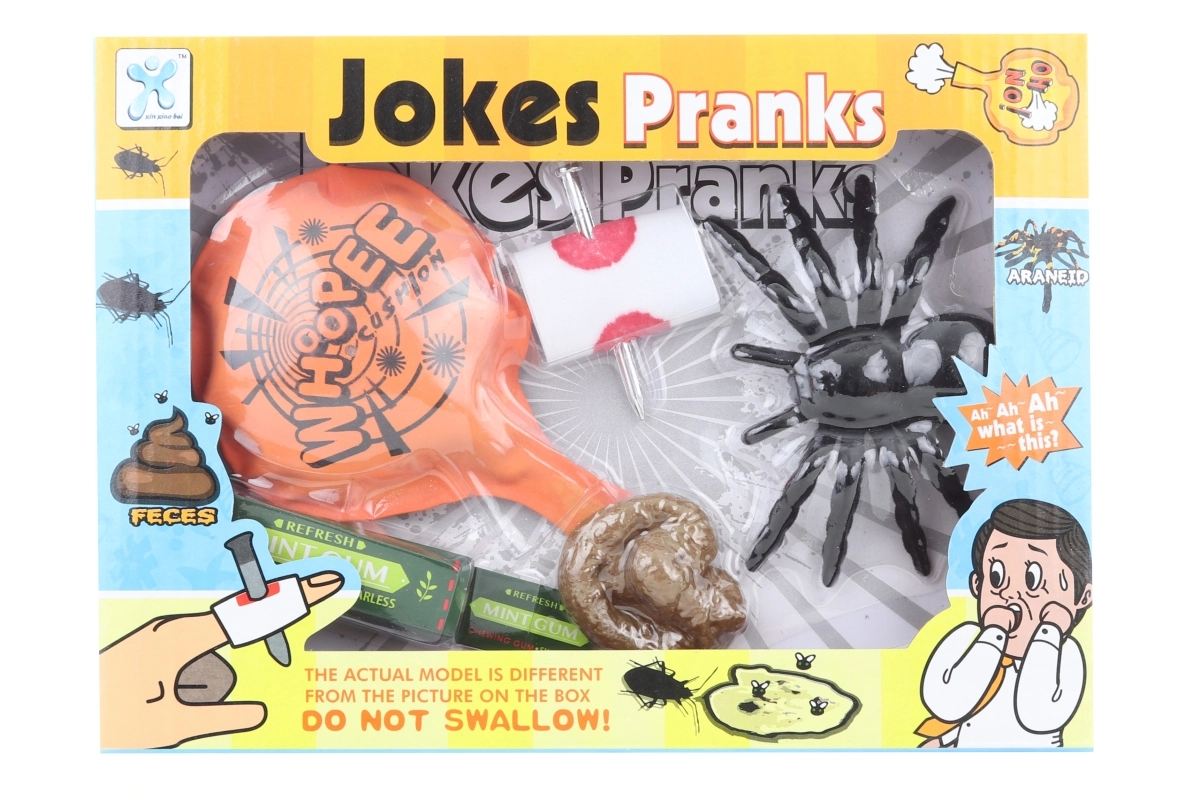 Ein lustiges Set mit Scherzartikeln für kleine und große Spaßvögel sorgt für stundenlanges Lachen und Überraschungen. Enthält ein Whoopee-Kissen, falschen Hundehaufen, eine Spinne, einen Nagel mit Verband und Kaugummi mit Falle. Ideal für Feiern, Partys und Spaß zu Hause. Geeignet für Kinder ab 3 Jahren.