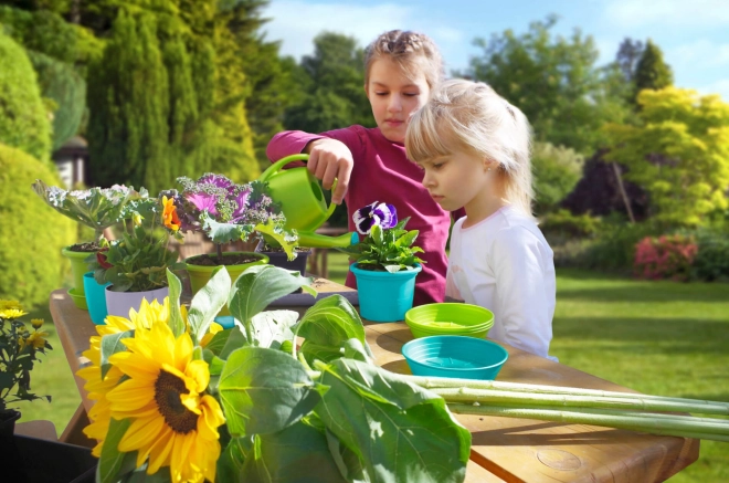 Mit diesem Set können Kinder die Grundlagen des Gärtnerns lernen und gleichzeitig Spaß im Freien beim Anbau eigener Pflanzen in bunten Blumentöpfen haben.