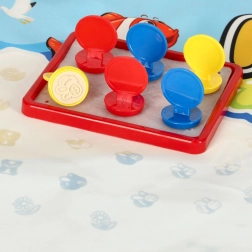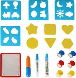 Im Lieferumfang enthalten sind Stempel, Schablonen, Wasserstifte und ein Pinsel. Kinder lernen Formen und Farben und verbessern ihre Feinmotorik.