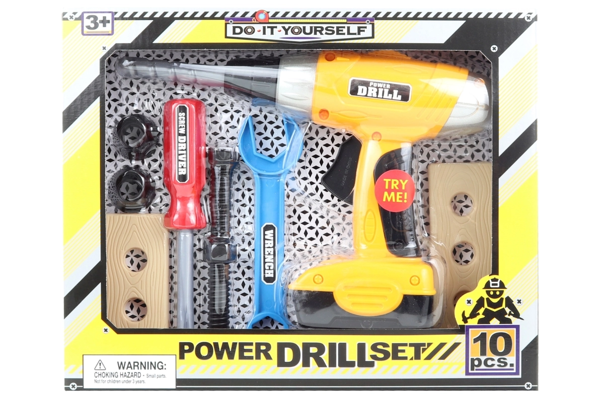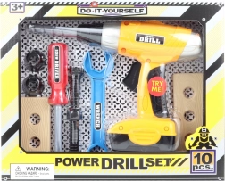 Ein unterhaltsames und sicheres Kinder-Werkzeugset mit realistischer Bohrmaschine ohne Batterien, die sich beim Drücken dreht und brummt. Enthalten sind außerdem Schraubendreher, Schlüssel, Holzleisten und Schrauben für kreatives Montieren. Ideal für Kinder ab 3 Jahren.