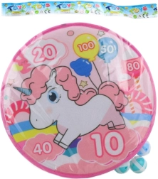 Unterhaltsame Kinder-Dartscheibe mit Einhornmotiv, Durchmesser ca. 35 cm, mit sechs Klettbällen für sicheres Werfen. Ideal zur Förderung von Motorik, Genauigkeit und Hand-Auge-Koordination für Kinder ab 3 Jahren.