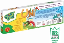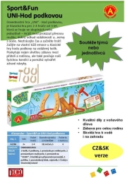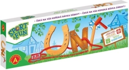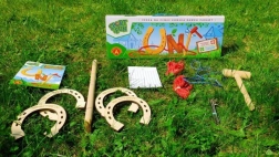 - 1 Pfosten, 4 Hufeisen, 1 Schnur für das große Feld, 1 Schnur für das kleine Feld, 1 Schnur „START“, 8 Pflöcke, 1 Schlagholz, 1 Notiz-/Punktblock, Anleitung DE und SK