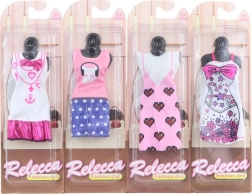 Die Kleider sind für Puppen entworfen und kommen mit Maßen von ungefähr 12,5 x 5,5 cm, abhängig vom Typ. Sie sind in einer Plastikverpackung verpackt und ihre Farbgebung wird nach aktuellem Lagerbestand bestimmt. Jedes Stück ist Teil der exklusiven Kollektion Rebecca, die eine bunte Auswahl und elegantes Design bietet.