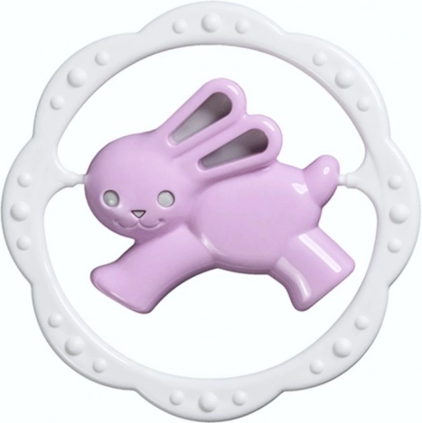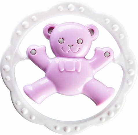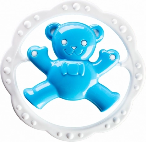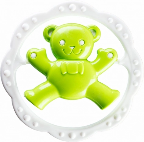 Die farbenfrohe Baby-Rassel mit Beißring in Kreisform und mit dem Motiv eines Bären oder Häschens beruhigt das Zahnfleisch beim Zahnen und fördert zugleich die Feinmotorik und das visuelle Wahrnehmungsvermögen. Das kompakte, leichte Design ist ideal für kleine Kinderhände.