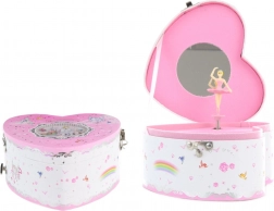 Elegantes herzförmiges Schmuckkästchen mit Spieluhr, das jede Liebhaberin niedlicher Accessoires erfreut. Nach dem Aufziehen dreht sich im Inneren eine Ballerina und es erklingt eine Melodie. Innen finden Sie einen Spiegel und Platz für kleine Schätze. Romantisches Design, tanzende Ballerina und praktische Schmuckaufbewahrung in einem.