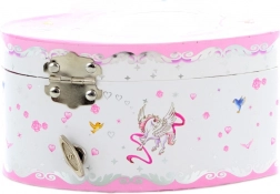 Dieses zauberhafte Musik-Schmuckkästchen in Herzform ist der ideale Platz zur Aufbewahrung von Ringen, Ohrringen und kleinen Kostbarkeiten. Nach dem Aufziehen erklingt im Inneren eine Melodie und die kleine Ballerina beginnt sich elegant vor dem Spiegel zu drehen. Das Design in Rosatönen mit zarten Motiven verzaubert Kinder wie Erwachsene.