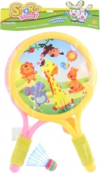 Unterhaltsames Set für kleine Sportler: zwei leichte Kunststoffschläger mit Tiermotiven, ein Kunststoffball und ein Fangkorb. Ideal zum Spielen zu Hause und draußen. Fördert Bewegung, Koordination und Feinmotorik bei Kindern ab 3 Jahren.