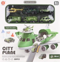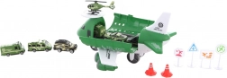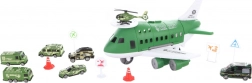 Flugzeug mit ausklappbarer Garage und Militärautos