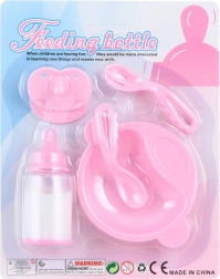 Satz Puppenzubehör ideal für Rollenspiele als Mama, enthält eine Flasche, Schnuller, Teller und Besteck. Perfektes Zubehör für jede kleine Pflegerin.