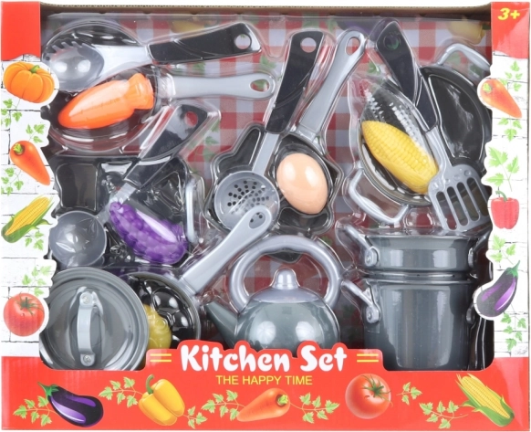 Komplettes Kinderküchen-Set für kleine Köche bietet alles Nötige für kreatives Spielen. Enthält einen Stieltopf mit Deckel, einen Topf mit Siebeinsatz, eine Kanne, eine Bratform, Pfannen, einen Wok sowie weiteres Zubehör und Lebensmittel. Ideal für Kinder ab 3 Jahren. Unterstützt die Entfaltung der Fantasie, Rollenspiele und die Feinmotorik.
