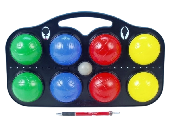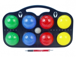 Satz von acht Kunststoffkugeln für Pétanque, die ideal für lustige Outdoor-Aktivitäten sind. Jede Kugel hat eine einzigartige Farbe für einfache Identifizierung während des Spiels. Dieses Set wird in einer praktischen Verpackung geliefert, die sowohl Lagerung als auch Transport der Kugeln erleichtert.
