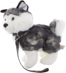Plüsch-Husky mit einer Größe von ca. 25 × 23 × 11 cm. Leinenlänge ca. 22,5 cm. Alter 0+.
