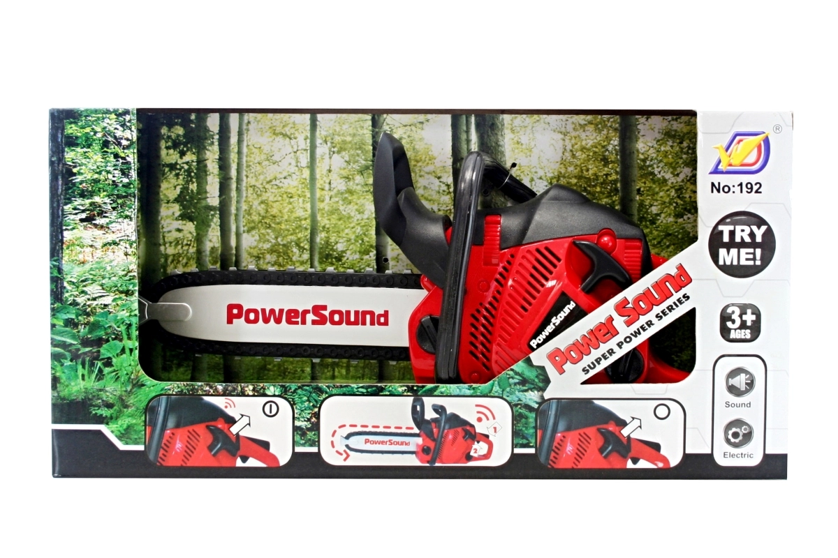 Diese Kinder-Kettensäge aus Kunststoff imitiert originalgetreu das Aussehen und die Geräusche eines echten Werkzeugs und ist gleichzeitig vollständig auf Kinderhände abgestimmt. Dank zweier Tasten starten Kinder leicht den „Motor“, aktivieren Soundeffekte und lassen die sichere, simulierte Kette laufen.